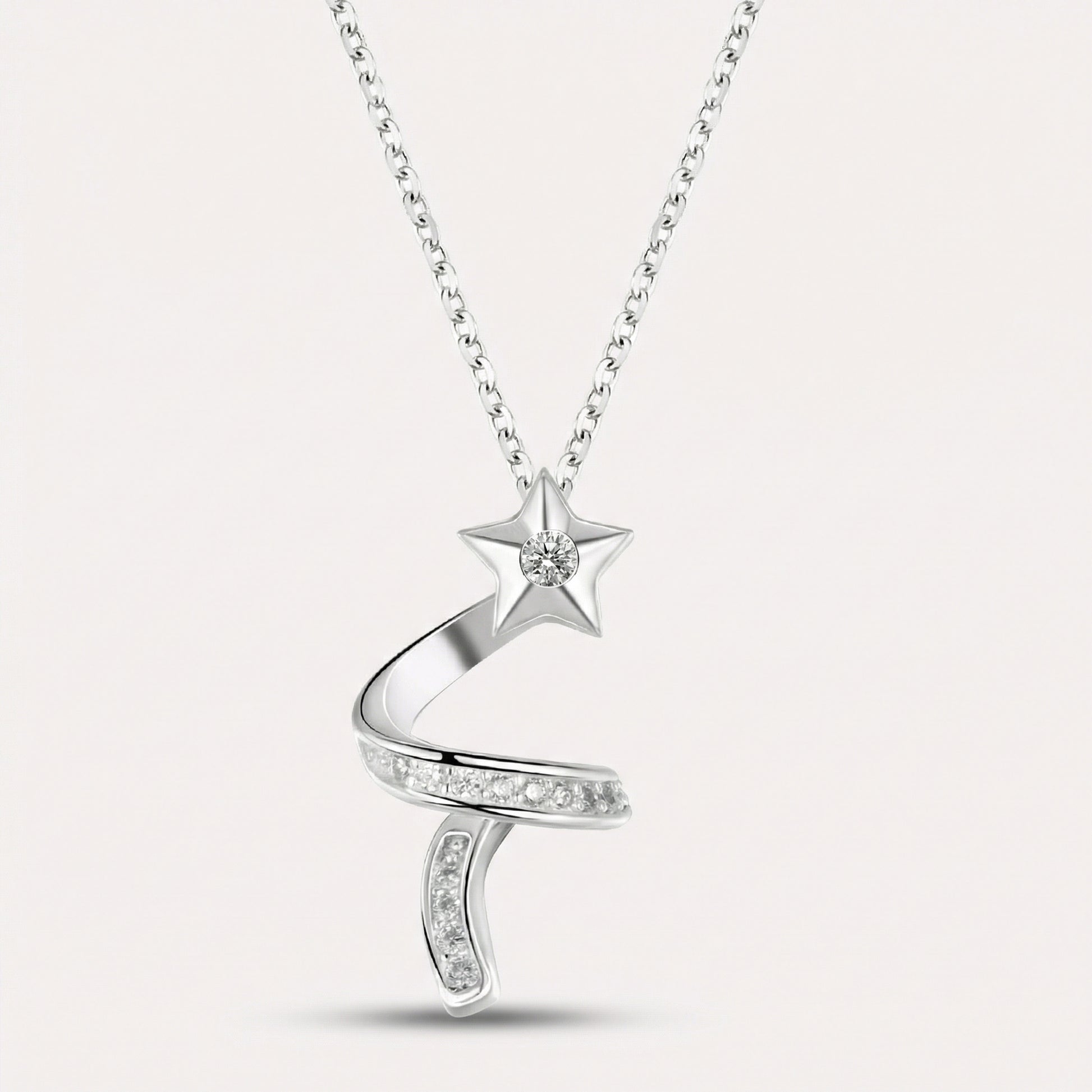 De Cosmic Necklace volgt een pad van aarde naar hemel. Een lint van gepolijst zilver buigt omhoog en vangt het licht, bekroond door een enkele ster met een gedetailleerd ontwerp in het midden. Vervaardigd uit hoogwaardig sterling zilver, rust het dicht bij het sleutelbeen – een subtiele herinnering om omhoog te kijken.